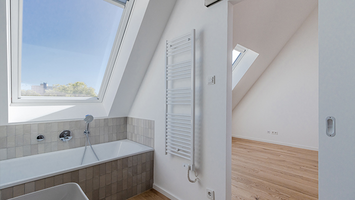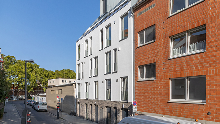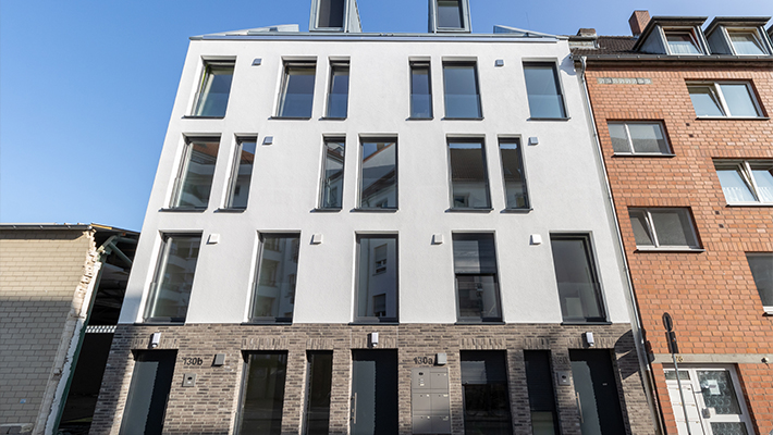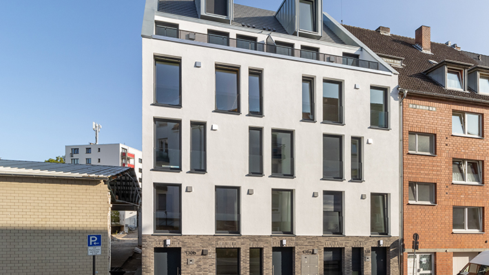 Abwechslungsreich und doch ganz entspannt – in Ehrenfeld, dem Stadtteil von Köln mit der einzigartigen Atmosphäre, entstand ein Vorder- und Hinterhaus mit insgesamt 7 Wohneinheiten. In zentraler aber ruhiger Lage realisierte die Peters Bauträger GmbH attraktive zwei Fünf-Raum-Wohnungen, vier Vier-Raum-Wohnung und eine Drei-Raum-Wohnung, die ausgestattet sind mit Balkon, Terrasse oder Loggia. Die besonders schöne Lage in Form einer ruhigen Oase mitten im pulsierenden Veedelsleben sowie die hochwertige Ausstattung und praktische Besonderheiten, wie z. B. das Dreifach-Parksystem, hochwertige Bodenfliesen und Parkettböden, Wärmeschutzglas, Aufzug, Fußbodenheizung sowie elektrisch betriebene Rollläden, machen den speziellen Reiz dieses Neubauprojekts aus. Noch besser lassen sich Lebensqualität und Wohnkomfort nicht vereinen.